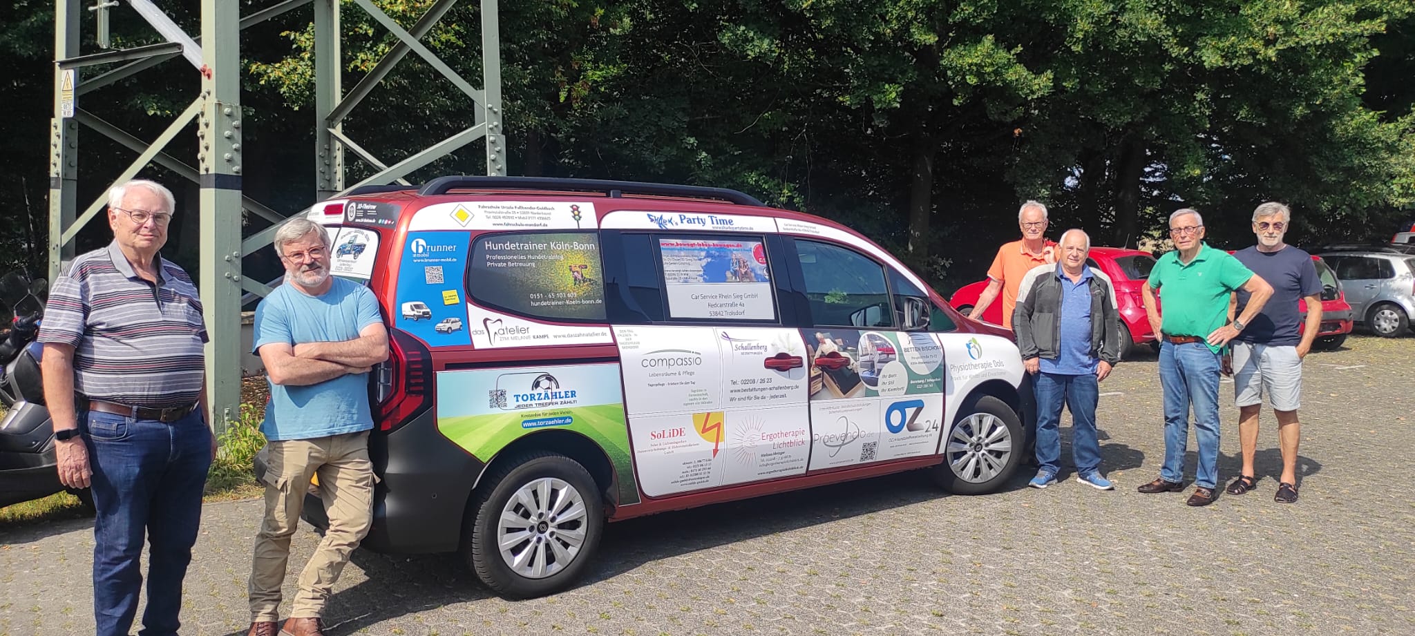 40 Sponsoren haben tief in die Taschen gegriffen – nicht nur große Sponsoren wie die SEG, Stadtmarketing Niederkassel und Compassio sondern auch viele kleinere Unternehmen. Übrigens sollte jeder Seniorin einmal prüfen lassen, ob ihm/ihr nicht eine Pflegestufe zusteht. Das besondere an diesem Auto ist die Grundfarbe. Normalerweise werden die Sponsorenaufkleber auf ein weißes Auto geklebt. Aber viel besser kommen die Sponsorenaufkleber auf der vom Verein gewählten Grundfarbe heraus – ein schönes rotbraun. Dadurch ist das Auto zudem ein richtiger Hingucker geworden.